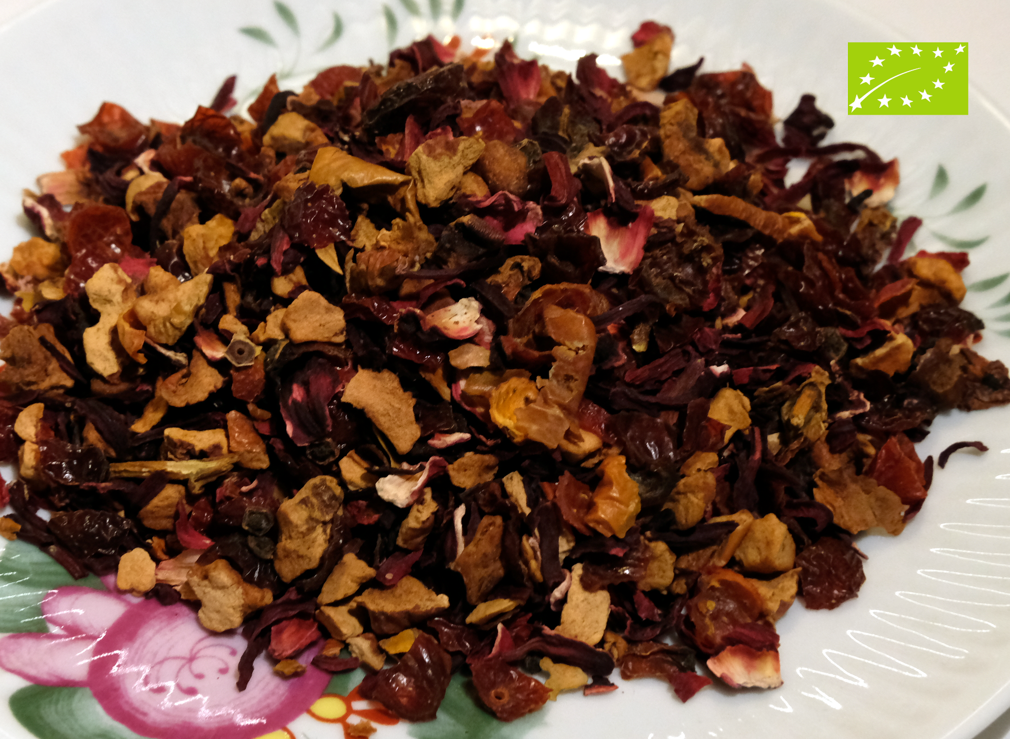 Zutaten: Apfelstücke, Hagebuttenschalen, Hibiscusblüten